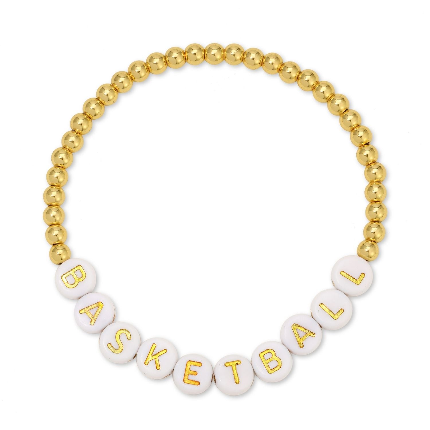 Meticulously crafted, this stretch bracelet features a beautiful combination of white and gold letter beads that boldly spell out "BASKETBALL." Interspersed throughout are dazzling 18K gold plated brass beads, adding a touch of rich, warm luster that elevates the entire design. The premium 18K gold plating ensures lasting beauty and resistance to everyday wear.