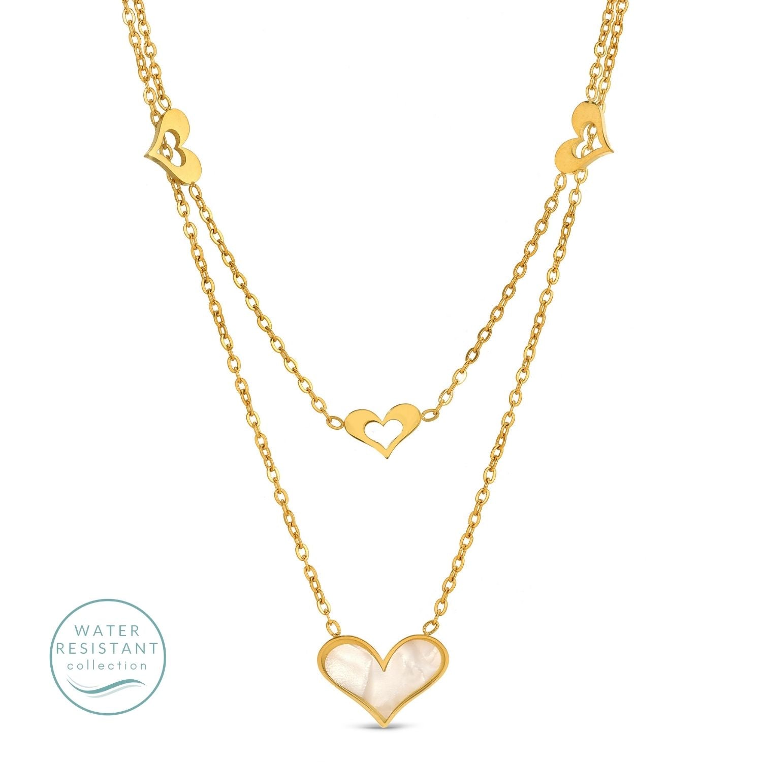 This beautifully designed necklace features two perfectly layered chains. The first layer showcases a delicate chain adorned with dainty heart charms, adding a subtle touch of romance. The second, longer layer proudly displays a unique heart-shaped shell pendant, bringing a touch of organic beauty and coastal charm to this already stunning piece. The combination creates a harmonious, layered look that's both meaningful and effortlessly chic. Add this waterproof gold necklace to your collection today and let your style speak volumes!