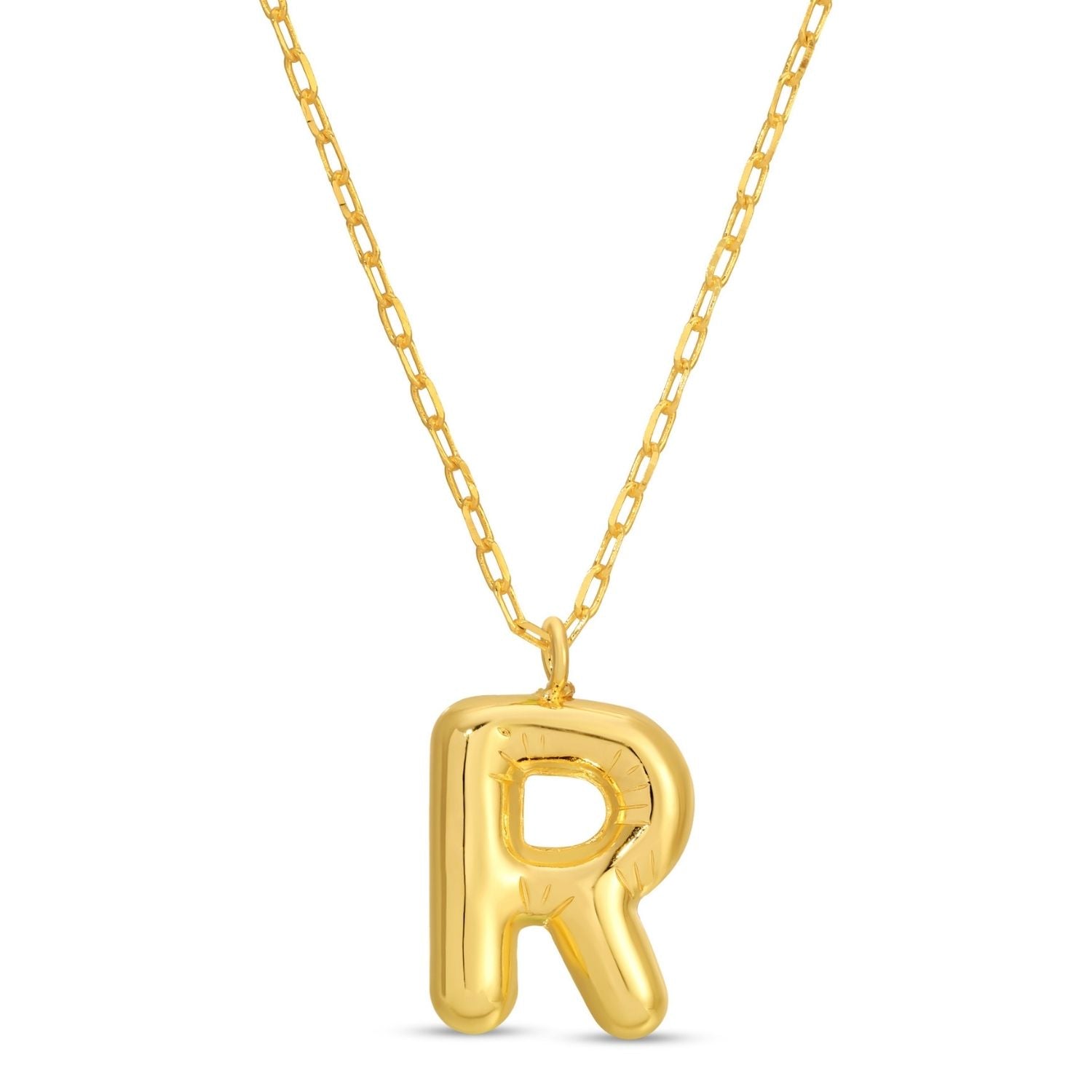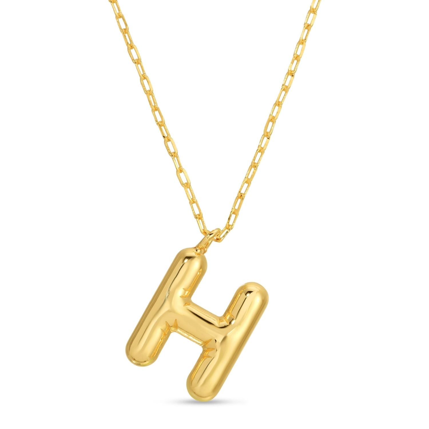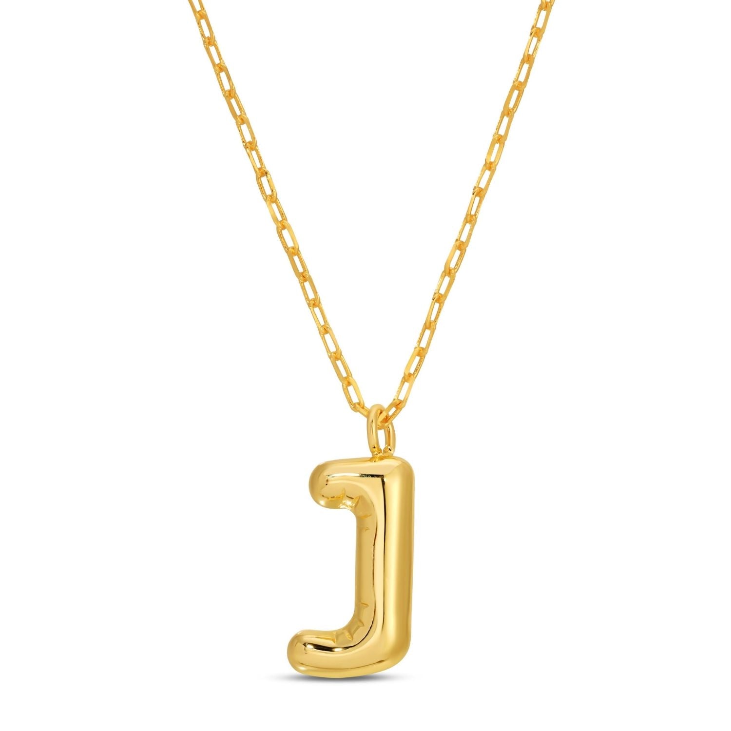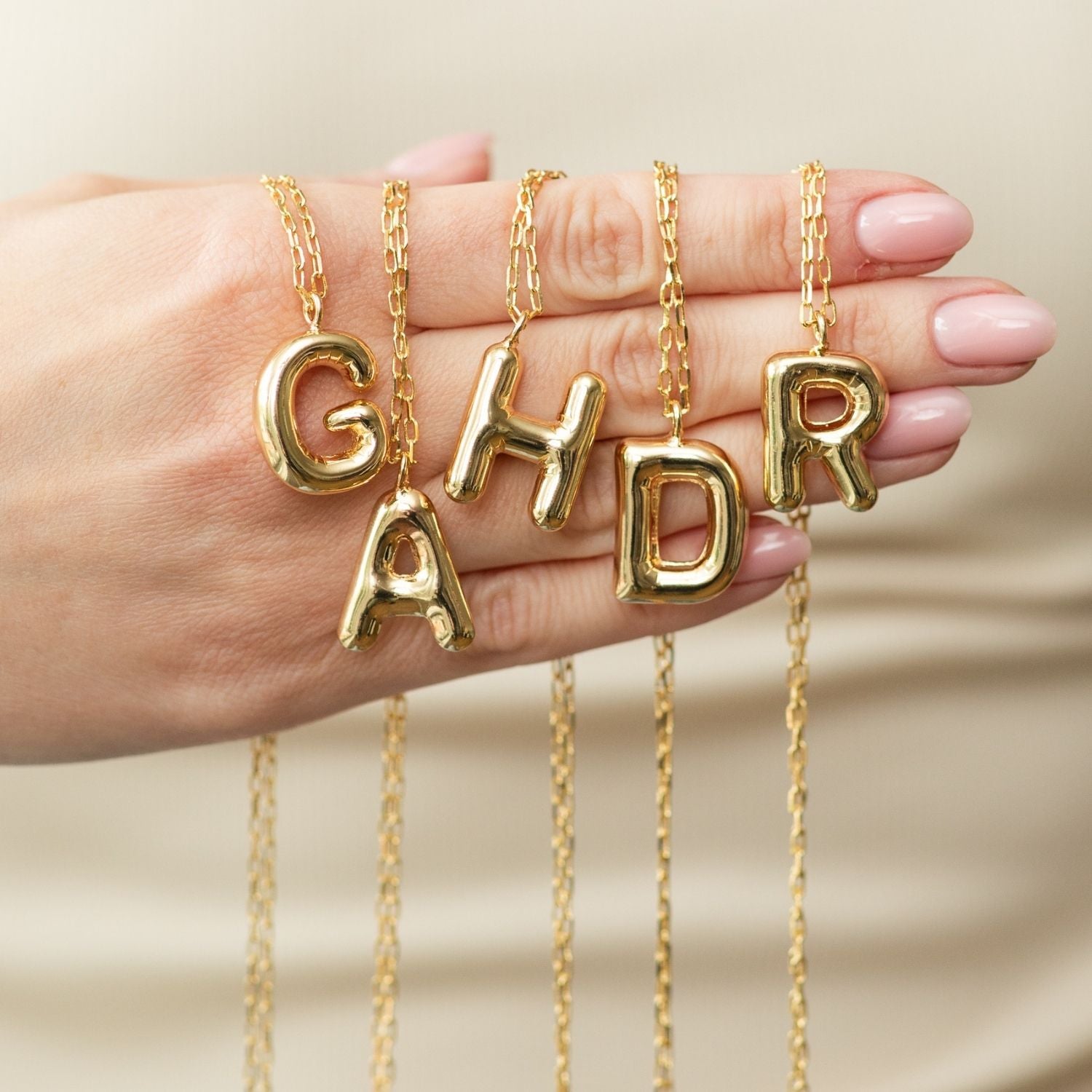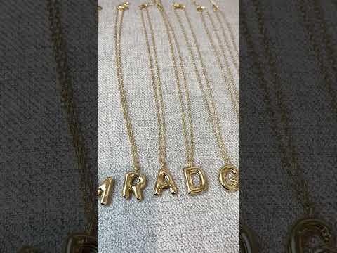 Meticulously crafted with a durable brass base, this necklace is then lavishly coated with a radiant 18K gold plating, providing the rich, warm luster of solid gold. This premium plating ensures lasting beauty and resistance to everyday wear. The centerpiece of this captivating necklace is the charming balloon initial pendant, featuring an oversized, puffed letter design that's both whimsical and chic.