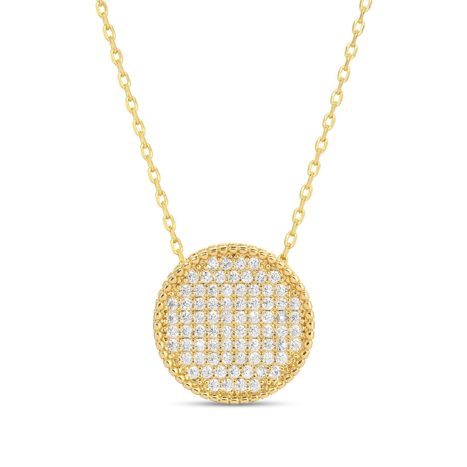 This elegant necklace features a delicate circle adorned with sparkling cubic zirconia, complete with a chain that threads through the center.